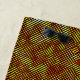 Listras amareladas inclinadas que em partes são opacas ou manchadas e perfuradas de uma forma que gera um efeito queimado.