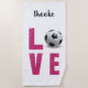 Love Soccer word design com letras faíscas cor-de-rosa quente e o "o" é substituído por uma bola de futebol.