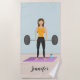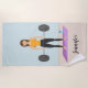Esta toalha mostra a ilustração de Destei de uma garota fofa que está matando uma campainha no chão. A menina tem cabelo comprido e está vestindo uma camisa cor de laranja. A garota está em um tapete roxo que tem uma garrafa de água azul nele. Há também uma área de texto personalizável para um nome.
