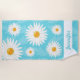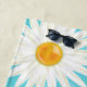 Esta toalha de praia apresenta flores de margaridas brancas ilustradas pela Destei em vários tamanhos. A cor de fundo é azul e tem um padrão leve de folhas. Há também uma área de texto personalizável para um nome na parte inferior.