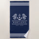Toalha de praia em lago, em azul marinho e branco, com um monograma náutico com âncora, verde e corda. Adicione seu nome inicial e sua família e ano estabelecido. Toalha da casa de praia em marinho e branco com um monograma de âncora emoldurado por verde, e seu nome familiar emoldurado por corda.