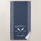 Personalize sua casa no lago com uma toalha de praia fofa personalizada com seu nome de família ou nome de casa e ano em caracteres brancos acentuados com um par de remos ou remos de canoa em um fundo azul marinho.