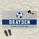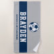 Design de toalha de praia personalizada para crianças e adolescentes apresenta uma bola de futebol personalizada com o número uniforme do jogador, texto personalizado para o primeiro ou sobrenome do jogador e texto moderno para o nome do time do futebol. Faz um presente de favor único para torneios e festas de piscina com a equipe! Na moda e design moderno apresentam cartazes de camiseta desportiva varsity e faixas simples horizontais. O esquema de cores das cinzas claras, marinho azul e branco pode ser modificado para coordenar com as cores da sua equipe.