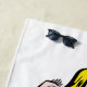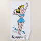 Esta repartição moderna de uma ilustração retro da propaganda tem um olhar do pop art e caracteriza uma beleza loura da praia em um biquini azul e branco das bolinhas.