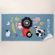 Esta toalha de praia para crianças bonitinhas e modernas apresenta desenhos fazendas, com um trator vermelho, vacas, porcos, ovelhas, galinhas e flores, e pode ser personalizada com o nome dos vossos rapazes. A agricultura perfeita temia presente para qualquer amante fazenda!