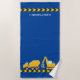 Legal toalha de praia de um veículo de construção azul para uma criança que ama veículos de construção amarelos em preto e amarelo. Um veículo divertido decor para um menino que ama carros e caminhões. Personalize com o nome do seu filho sob a fita de precaução preto e amarelo. Possui um misturador de concreto e um escavador com uma escavadora.