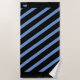 Esta toalha de praia é mostrada em fundo preto com riscas azuis brilhantes e arrojadas e com uma impressão de coroa azul brilhante em pontas opostas. Personalize com seu nome, título de concurso ou frase favorita. Personalizar este item.