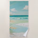 Uma pintura serena e cheia de luz de uma cena tranquila de praia. A composição é dividida em um céu macio com nuvens brancas e peludas, uma ampla extensão de um oceano azul-turquesa com ondas espinhosas e gentis, e uma costa arenosa. A praia é macia e branca, com sutis impressões de água fluindo pela areia. No primeiro plano, um aglomerado de plantas estilizadas verdes e azuis-claras adiciona um toque de detalhe natural. O fundo apresenta uma costa verde distante sob o céu limpo. O estilo é fluido e macio, com uma paleta harmoniosa de blues pastel, verdes e brancos, evocando uma atmosfera pacífica e sonhadora.