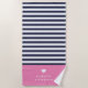 Toalha de praia na moda personalizada em cores rosa, marinho azul e branca. Este design apresenta um marinho clássico pré-disquete e um padrão listrado branco. Personalize-o com seu nome monograma ou outro texto personalizado com um símbolo cardíaco fofo. Use as ferramentas de design para escolher qualquer cor de fundo, editar as fontes de texto e as cores e carregar suas próprias fotos para criar uma única de uma toalha com monograma.