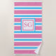 Esta toalha de praia listrada por na moda é perfeita para a praia, piscina ou lago. O design apresenta um impressão bonito, cor-de-rosa, branco e turquesa listrado, com um espaço para o seu monograma.