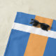 Monograma de três letras ajustado em um círculo branco, com beira circular cinzenta, sobre listras das canvas da cadeira de praia.