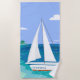 Um veleiro com seu nome, se aproximando de uma praia. Vista do mar tropical. Azul, lacrimejo, espuma marinha, turquesa, verde, branco.