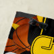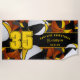 Esta toalha de praia fácil de personalizar para os jogadores de basquete apresenta cestos de tamanho variado com cores pretas e douradas viradas de qualquer maneira em um fundo escuro de cinza e um número de camisa proeminente em ouro sobre uma faixa preta de comprimento de cheio, na qual você também pode personalizar o nome do atleta, o nome da equipe e o nome da mascote em ouro - por katz_d_zynes