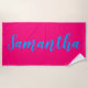 Um design incrível, esta toalha de praia personalizada apresenta um fundo cor-de-rosa neon com uma fonte azul brilhante para inserir o seu nome. Tão brilhante que se destaca, este design de pegar os olhos certamente vira as cabeças. Personalize sua toalha de praia hoje!