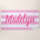 O design personalizado de toalha de praia apresenta texto personalizado em um script rosa-quente moderno que pode ser personalizado com um primeiro ou sobrenome contra um padrão de listras brancas em um fundo de rosa claro. As cores e o estilo de fonte podem ser completamente personalizados.