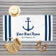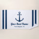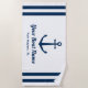 A toalha de praia náutica em formato horizontal apresenta uma âncora elegante de barco com faixas horizontais pré-definidas. Personalize o texto personalizado com o nome e a localização do barco. O design inclui um esquema clássico de cor azul e branca do marinho costeiro.
