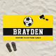 Design de toalha de praia personalizada para crianças e adolescentes apresenta uma bola de futebol personalizada com o número uniforme do jogador, texto personalizado para o primeiro ou sobrenome do jogador e texto moderno para o nome do time do futebol. Faz um presente de favor único para torneios e festas de piscina com a equipe! Na moda e design moderno apresentam cartazes de camiseta desportiva varsity e faixas simples horizontais. O esquema de cores de amarelo, preto e branco pode ser modificado para coordenar com as cores de sua equipe.