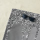 Aproveite esta elegante design com seu nome e monograma ou inicial com gotas de brilho e cinza prateada sobre um fundo metálico de cinza prateada.