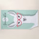Uma toalha de praia que apresenta um lama ilustrado que está vestindo um par de óculos flamingos cor-de-rosa. O lama está em frente a um fundo verde claro de herança e o design da toalha inclui um nome e um monograma personalizáveis. O esquema de cores é branco, verde claro e rosa.