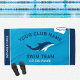 Design de toalha de piscina personalizada da equipe de natação para nadadores apresenta texto personalizado para o primeiro e sobrenome do nadador, nome do clube da natação e mascote ou outro texto. Adicione o logotipo da sua equipe à imagem de marcador de posição do golfinho. O esquema de cores do azul-oceano, azul-marinho e branco pode ser modificado para se coordenar com as cores de sua equipe. Entre em contato conosco em kathleen@plushpaper.com com perguntas sobre o design.