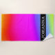 As características deste design de toalha de praia um divertimento, arco-íris-como o teste padrão colorido do inclinação que caracteriza várias máscaras das cores gostam amarelo, alaranjado, vermelho, cor-de-rosa, roxo, azul e verde. Igualmente caracteriza um nome personalizado no texto colorido branco dentro de uma área colorida obscuridade na parte dianteira. [~Z0000000]