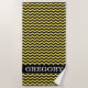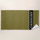 Características deste design de toalha de praia uma linha ondulada amarela e preta teste padrão. Igualmente caracteriza um nome feito sob encomenda no texto colorido branco dentro de uma área colorida obscuridade na parte dianteira. [~Z0000000]