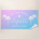 Design personalizado de toalha de praia para uma fuga de praia para meninas, apresenta um nome personalizado em um roteiro moderno, acentuado com estrelas-do-mar e enquadrado por palmeiras tropicais. Personalize com um nome e texto personalizado para a ocasião especial. O plano de fundo inclui um bonito gradiente do pôr do sol em cores rosa claro, violeta roxo e azul.
