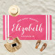 Design personalizado de toalha de praia para uma viagem de fim de semana feminina apresenta um nome personalizado em um roteiro moderno, escrevendo por listras costeiras, com texto personalizado para a ocasião. A cor de fundo rosa quente pode ser modificada. Visite nosso compro para obter outras opções de cor.