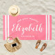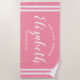 Design personalizado de toalha de praia para uma viagem de fim de semana feminina apresenta um nome personalizado em um roteiro moderno, escrevendo por listras costeiras, com texto personalizado para a ocasião. A cor de fundo rosa bonito pode ser modificada. Visite nosso compro para obter outras opções de cor.