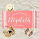 Design personalizado de toalha de praia para uma viagem de fim de semana feminina apresenta um nome personalizado em um roteiro moderno, escrevendo por listras costeiras, com texto personalizado para a ocasião. A cor bonito de fundo laranja/rosa pode ser modificada. Visite nosso compro para obter outras opções de cor.
