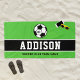 Design de toalha de praia personalizada para crianças e adolescentes apresenta uma bola de futebol personalizada com o número uniforme do jogador, texto personalizado para o primeiro ou sobrenome do jogador e texto moderno para o nome do time do futebol. Faz um presente de favor único para torneios e festas de piscina com a equipe! Na moda e design moderno apresentam cartazes de camiseta desportiva varsity e faixas simples horizontais. O esquema de cores do verde-claro-grama, preto e branco pode ser modificado para coordenar com as cores de sua equipe.