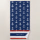 Crie uma toalha de praia náutica monograma que tenha um texto de modelo para personalizá-la com seu nome. O design apresenta o padrão das âncoras brancas e as faixas desenhadas à mão em branco e vermelho sobre um fundo azul-marinho claro. É uma ideia perfeita de presente para férias familiares num iate, barco ou cruzeiro.