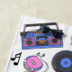 Registros vinílicos azuis e cor-de-rosa, caixas de expansão, jogos de vídeo e fitas cassetes nostálgicas de toalha de praia.