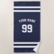 O costume ostenta a toalha de praia dos azuis marinhos do número do jérsei do futebol. Beachtowel feito sob encomenda com listras atléticas e tipografia. Adicione suas próprias letras do nome ou do monograma. Refrigere a ideia do presente de aniversário para o pai legendário, o melhor marido, o vovô super, o filho, o pai, o pai novo, tio do mundo o grande, o stepdad, o irmão, o amigo aposentado, o noivo, o chefe, o trabalhador do co, o colega, o treinador de esportes, o instrutor pessoal, o instrutor da malhação, o pensionista, o jogador de futebol, o atleta, o fã, o adolescente, os miúdos, os acessórios do verão do divertimento do menino etc. para a praia ou a piscina. Design desportivo com cor customizável do fundo. Igualmente agradável para outros esportes de equipe goste do futebol, do voleibol, do basquetebol, do hóquei etc.