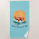A adorável toalha de praia "vibes de verão" apresenta design de arte digital aquarela de um urso marrom giro giro flutuando pelo rio com texto "vivendo a vida do rio".