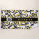 Esta toalha de praia em padrão de volleyball apresenta um padrão aleatório de vulicões preto, dourado e branco estilizados de tamanho variado que se virou em todos os sentidos num fundo branco personalizável - personalize com seu nome e número de camisa - por katz_d_zynes