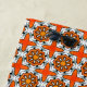 Image showing vibrant towels and a washcloth with intricate orange, blue, and white geometric patterns. Towel set hangs neatly; washcloth is flat with a corner flipped.