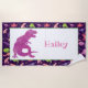 Os miúdos personalizaram a toalha de praia roxa de T-Rex da aguarela do dinossauro. Teste padrão do dinossauro do divertimento em cor-de-rosa da aguarela e verde roxos no fundo roxo escuro. É no centro um t-rex verde maior com nome no rosa. www.SamAnnDesigns.com