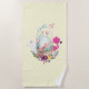 Uma toalha de praia com uma fofa pintura em aquarela de um ovo verde pálido sentado dentro de uma cesta de vime. Decorado com fitas, laços, flores e corações. Um flamingo rosa e um coelho branco ao seu lado. Fundo amarelo pastel.