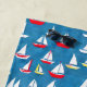 Padrão com ilustração de veleiros vermelhos e amarelos sobre fundo azul.