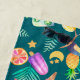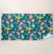 Imagens tropicais divertidas fazem um padrão colorido nesta linda toalha de praia. As imagens incluem um pássaro tucano, um flamingo rosa, um cone de sorvete, bares de sorvete, uma fatia de toranja brilhante, e um limão, todos cercados por estrelas ousadas e folhas de palma verdes. As imagens multicoloridas e brilhantes são colocadas sobre um fundo de cor escura e repetidas na superfície da toalha. Brilhante, colorido e divertido, não importa onde você passe o verão!