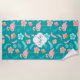 Um bonito padrão floral aqua, rosado e flamingo e flor de hibisco é a característica desta toalha tropical de praia. No centro há um banner branco ornamentado com seu monograma em cor-de-rosa correspondente e seu nome em um roteiro teal sobre ele. Tudo é colocado sobre um fundo mais escuro.