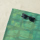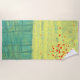 Uma pintura de paisagem amarela e verde em verde e amarelo de um campo ou cheio de flores silvestres com uma floresta de pinheiros no horizonte. Arte original de Nic Squirrell.