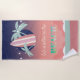 Toalha tropical de praia com palmas, lanternas e pranchas.