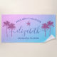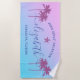 O design personalizado da toalha de praia para as férias de uma viagem das meninas apresenta um primeiro nome personalizado em escrita moderna acentuado com uma estrela-do-mar e emoldurado por palmeiras tropicais. Personalize com um nome e texto personalizado para a ocasião especial. O fundo inclui um gradiente de pôr do sol bonito em cores violeta, roxo e azul.