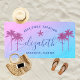 O design personalizado da toalha de praia para uma viagem de férias das meninas apresenta um primeiro nome personalizado em escrita moderna acentuado com uma estrela-do-mar e emoldurado por palmeiras tropicais. Personalize com um nome e texto personalizado para a ocasião especial. O fundo inclui um gradiente de pôr do sol bonito em cores violeta, roxo e azul.