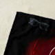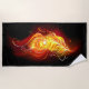 Pena de pavão brilhante feita de fogo e chamas sobre fundo negro.