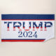 Esta toalha de praia da campanha presidencial Donald Trump 2024 mostra o nome "Trump" impresso em um padrão de bandeira americano. As estrelas são impressas na metade superior e as listras na parte inferior. O ano de eleição "2024" é impresso abaixo em uma fonte azul marinho. As partes superior e inferior da toalha apresentam faixas azuis e vermelhas.