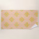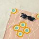 Hexagonal floral pattern with blue-green centers and orange outlines on a peach background. White lines connect the shapes, creating a geometric grid.
