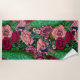 Padrão desenhado à mão com pavões e vários rosas sobre fundo escuro